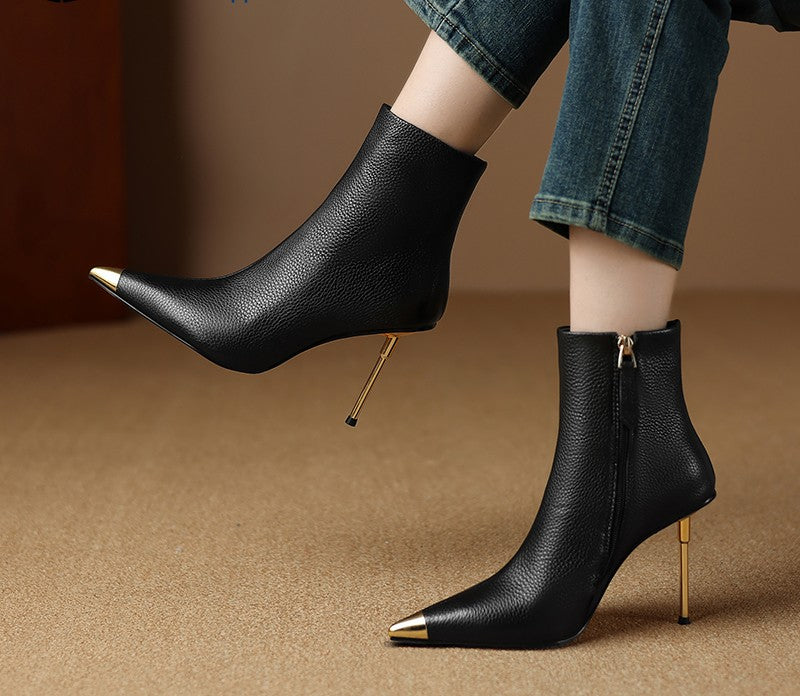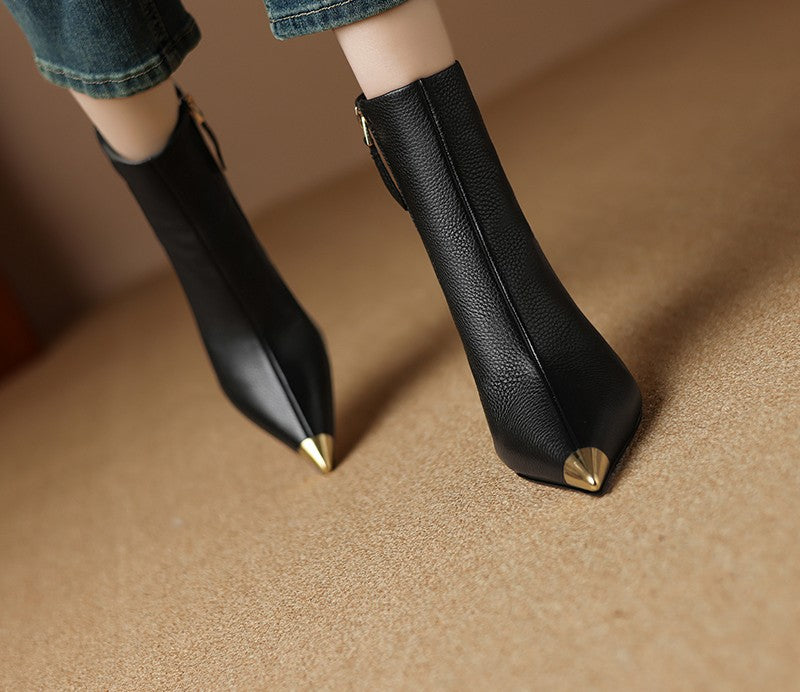 Step out in style with these genuine leather autumn and winter ankle boots, featuring a sleek pointed toe, sexy thin high heel, and convenient side zipper. Perfect for parties, work, or elevating any seasonal outfit, these fashionable booties combine elegance, comfort, and modern design.