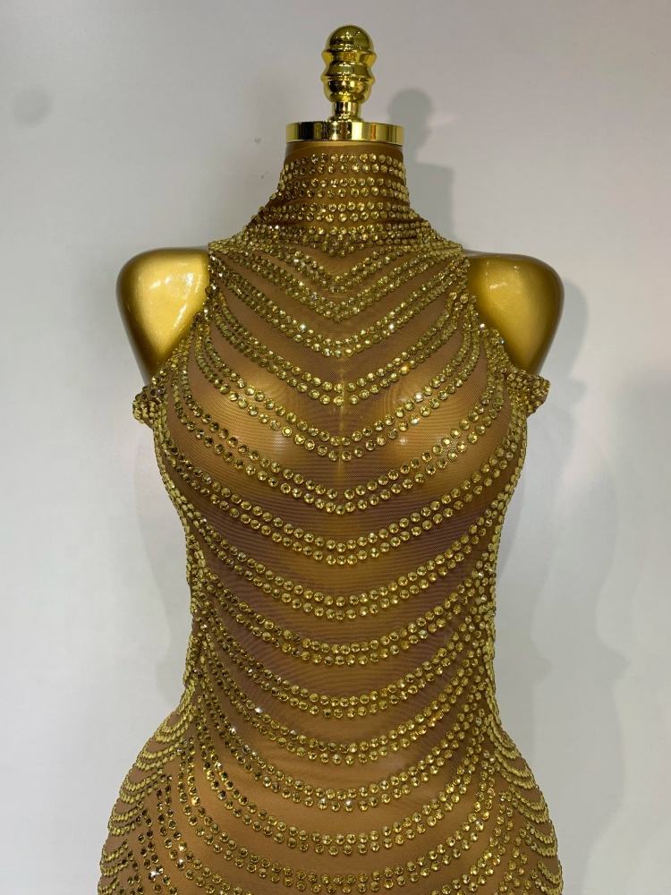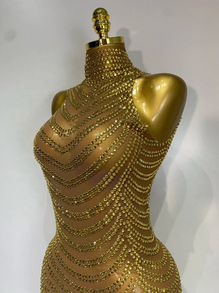 Shine with glamour in this gold sparkly rhinestone mesh evening dress, designed with a bold see-through style that adds modern allure. The shimmering rhinestone embellishments catch the light beautifully, while the figure-hugging silhouette enhances your curves for a stunning and sexy look.