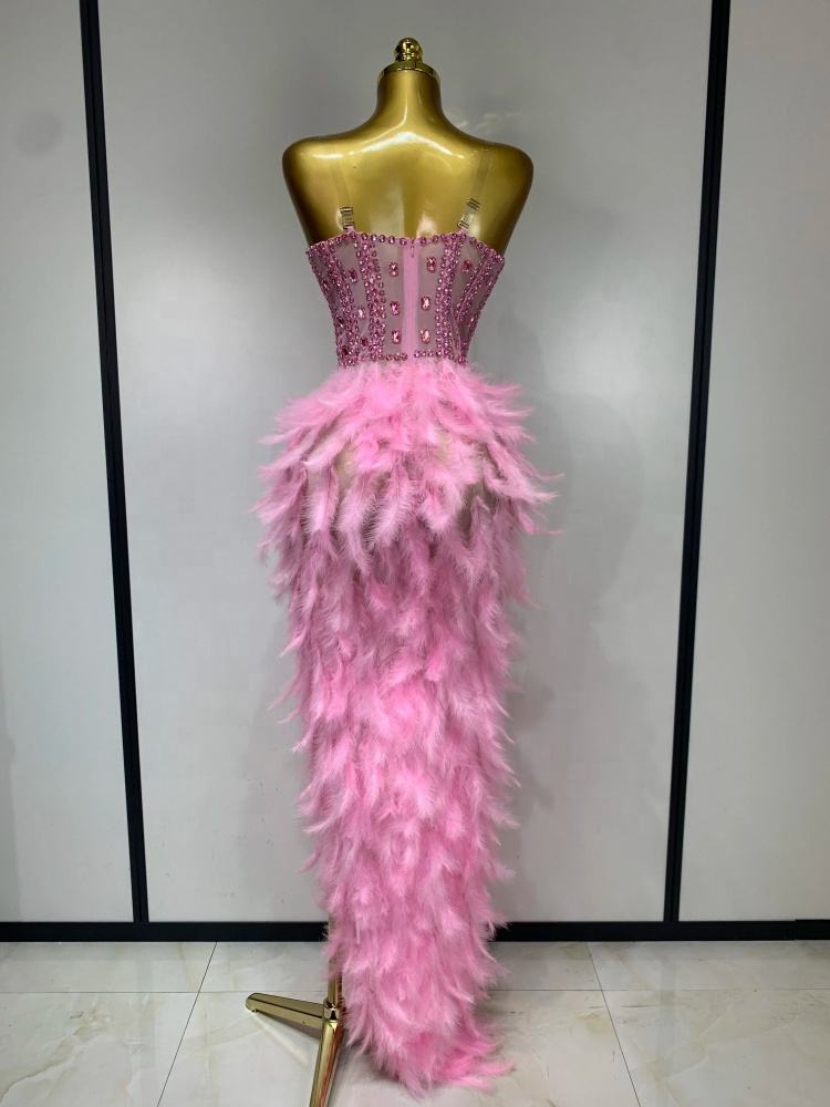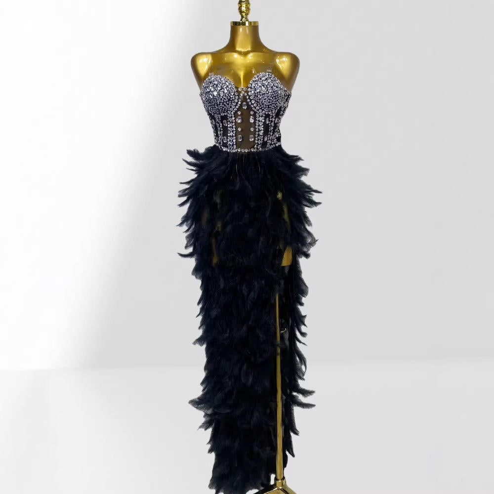 Step into glamour with this sparkly rhinestone feather mesh evening dress, designed to turn heads with its luxurious embellishments and daring, figure-flattering silhouette. The combination of rhinestones, delicate feathers, and sheer mesh creates a sophisticated yet sexy look perfect for upscale events.